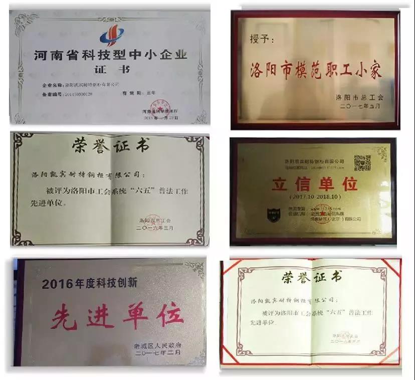 2014年取得ISO9001質(zhì)量管理體系、ISO14001環(huán)境管理體系 、OHSAS18001職業(yè)健康安全管理體系三大管理體系認(rèn)證,同年獲得河南省科技廳頒發(fā)的“科技型中小企業(yè)”,市科技局頒發(fā)的“市級企業(yè)研發(fā)中心”;2015年市工信委頒發(fā)“隱形企業(yè)”、“民營企業(yè)”,市科技局頒發(fā)“科技小巨人培育企業(yè)”,市總工會頒發(fā)“五一勞動獎狀”、“和諧勞動關(guān)系模范單位”;2016年洛陽市總工會頒發(fā)“六五普法工作先進(jìn)單位”;2017年老城區(qū)政府頒發(fā)“科技創(chuàng)新先進(jìn)單位”,洛陽市總工會頒發(fā)“模范職工小家”,同年通過綠盾企業(yè)征信系統(tǒng)認(rèn)證,中國環(huán)境標(biāo)志產(chǎn)品認(rèn)證;2019年獲得兩化融合管理體系評定證書,以及近年來共獲得外觀設(shè)計和實(shí)用新型33項(xiàng)。